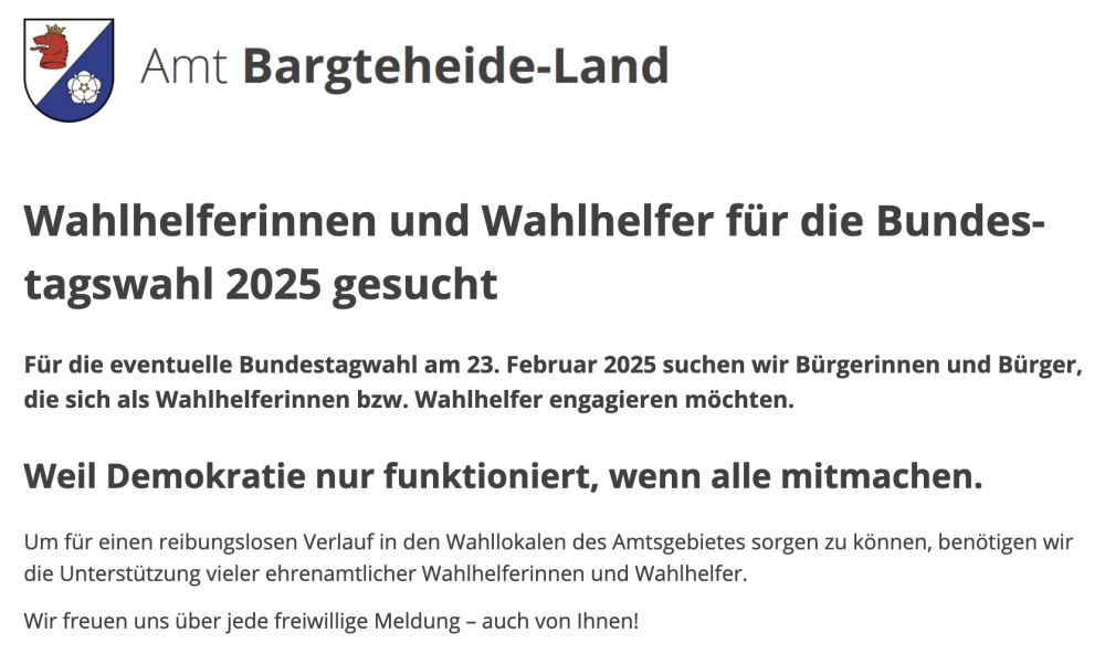 Für die eventuelle Bundestagwahl am 23. Februar 2025 sucht das Amt Bargteheide-Land Bürgerinnen und Bürger, die sich als Wahlhelferinnen bzw. Wahlhelfer engagieren möchten.