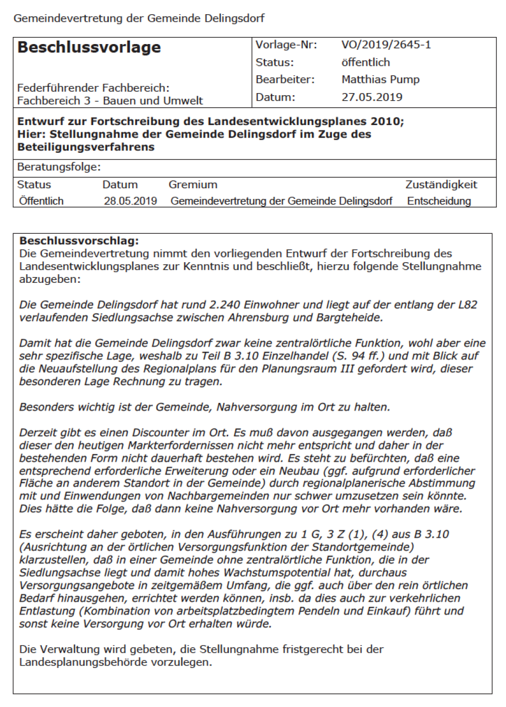 Da wir als CDU-Fraktion vorgetragen hatten, daß wir allerdings einen für die Zukunft des Dorfes wichtigen Punkt anmerken wollten — nämlich Rahmenbedingungen, die langfristige Nahversorgung/Einzelhandel ermöglichen, wurde unser Fraktionsvorsitzender Malte Steckmeister damit beauftragt, diesen Punkt aufzuarbeiten. Dieser wurde nun einstimmig beschlossen und geht damit in das Verfahren beim Land.