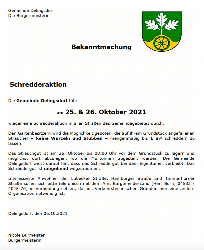 Das Strauchgut ist am 25. Oktober bis 08:00 Uhr vor dem Grundstück zu lagern und möglichst dort abzulegen, wo die Mülltonnen abgestellt werden. Die Gemeinde Delingsdorf weist darauf hin, dass das Schreddergut bei dem Eigentümer verbleibt! Das Schreddergut ist umgehend wegzuräumen.